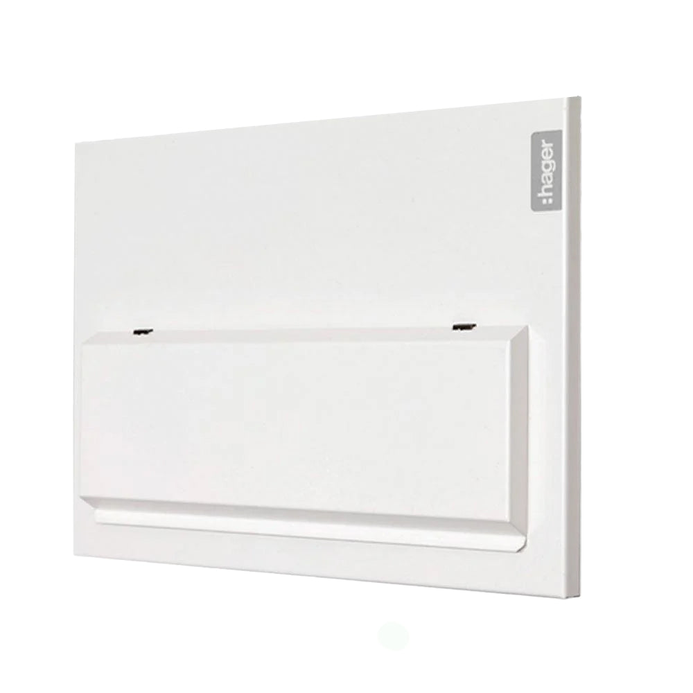 From Hager's 'Design 10' range, VMLF110 is a 10 way flush consumer unit designed for recessed fitting in areas where aesthetics are important. With a profile of just 35mm including the front door, it sits discreetly in any environment. Supplied empty with just the 100A main switch it should be populate with Hager RCBOs - providing excellent circuit separation and full 17th Edition Regulation compliance.