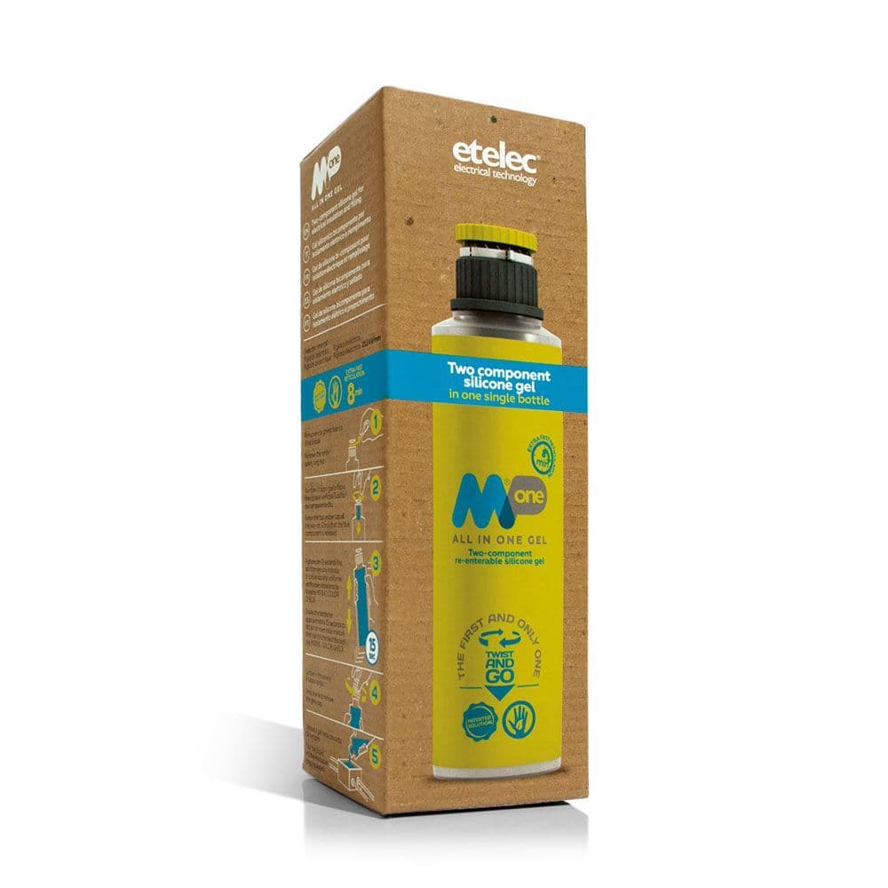 Two component silicone gel for electrical insulation and filling. Twist the cap to release both components and shake for 15 seconds. Once the contents of the whole bottle have turned blue, it's ready to use.